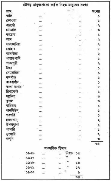 অসৎ উদ্দেশ্যে কিছু করা হয়েছে বলে সন্দেহ করা হয়। পরদিন কাছাকাছি গ্রামগুলি থেকে পুরুষদের জড়ো করা হয় ও এক তল্লাসী দল গঠিত হয়। আন্দাজ চারশো গজ দূরে একটি বাজেপোড়া ওক গাছের দিকে আঙুল দেখিয়ে আমার সংবাদদাতারা বলল যে ওটির নিচে মানুষটির দেহাবশেষ–তার খুলি, কয়েক কুচি হাড় ও পোশাক পাওয়া যায়। এটিই হল চৌগড়ের মানুষখাকীর প্রথম মানুষ শিকার।
