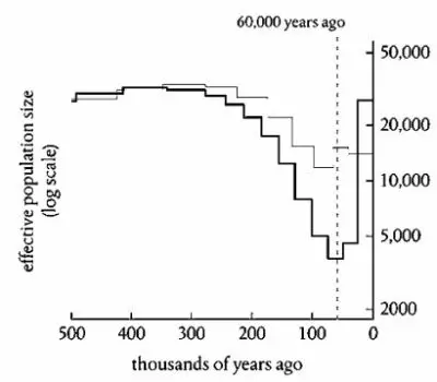 কালো রেখাটি (ছবি ১ দেখুন) ইতিহাসের নানা সময়ে একটি কার্যকর জনগোষ্ঠীর সম্ভাব্য আকার দেখাচ্ছে আমার জিনোমের উপর ভিত্তি করে (আমার বাবা ও মায়ের জিনের কোয়ালেসেন্সের)। এটি দেখাচ্ছে যে প্রায় ৬০,০০০ বছর আগে আমার পূর্বসূরি জনগোষ্ঠীর মধ্যে কার্যকর জনগোষ্ঠীর আকার কমে গিয়েছিল। ধূসর রেখাটি একই সমতুল্য প্যাটার্ন, যার উৎস একজন নাইজেরিয়ীয় ব্যক্তির জিনোম। এটিও সেই একই সময়ে জনগোষ্ঠীর আকারে নিম্নমুখী পতন দেখাচ্ছে, কিন্তু অপেক্ষাকৃত কম নাটকীয়তায় মাত্রায়। হয়তো যে বিপর্যয় এই নিম্নমুখী পতনের জন্যে দায়ী সেটি ইউরেশিয়ায় চেয়ে আফ্রিকায় কম প্রভাব ফেলেছিল।
