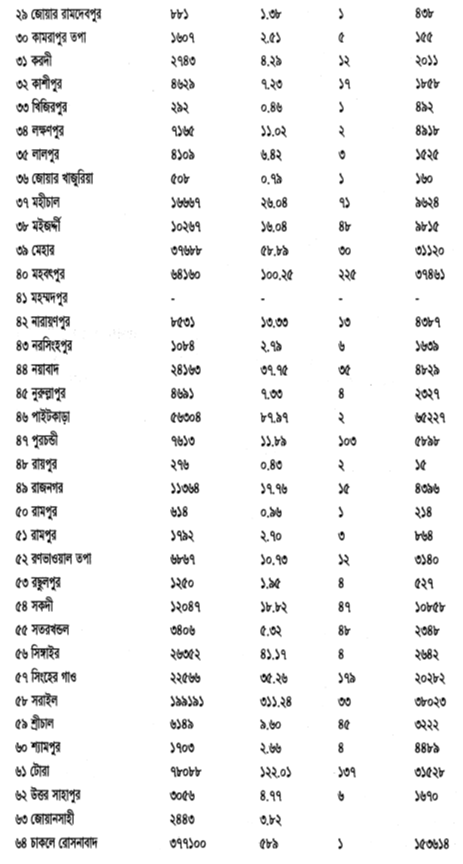 পরগণা বা মহালের নাম, ভূমির পরিমাণ, মহালের সংখ্যা, রাজস্ব